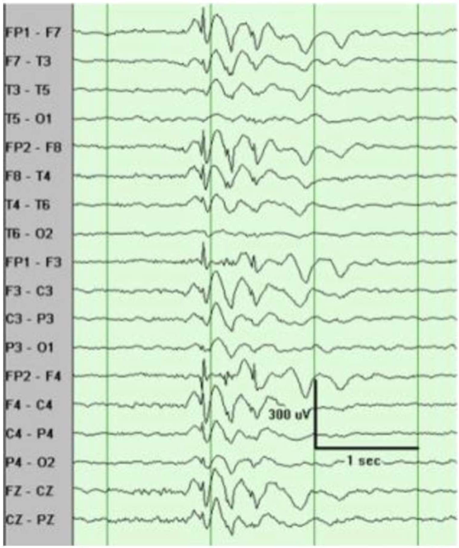 EEG consistent with generalized epilepsy. Spikes are usually followed by a slow wave.