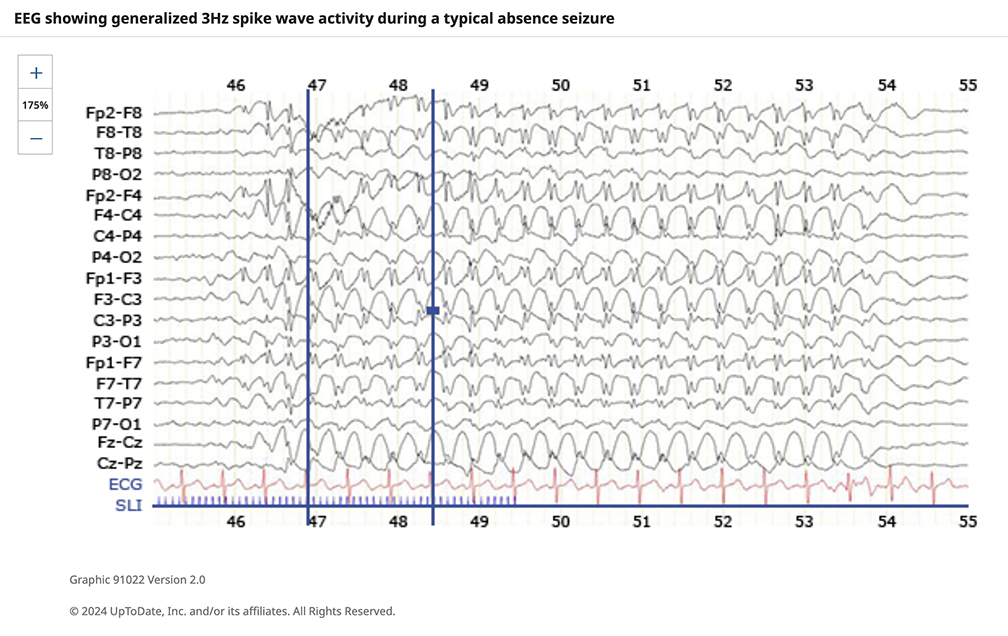 - EEG: 2.5–5 Hz spike wave discharges (3 Hz common).