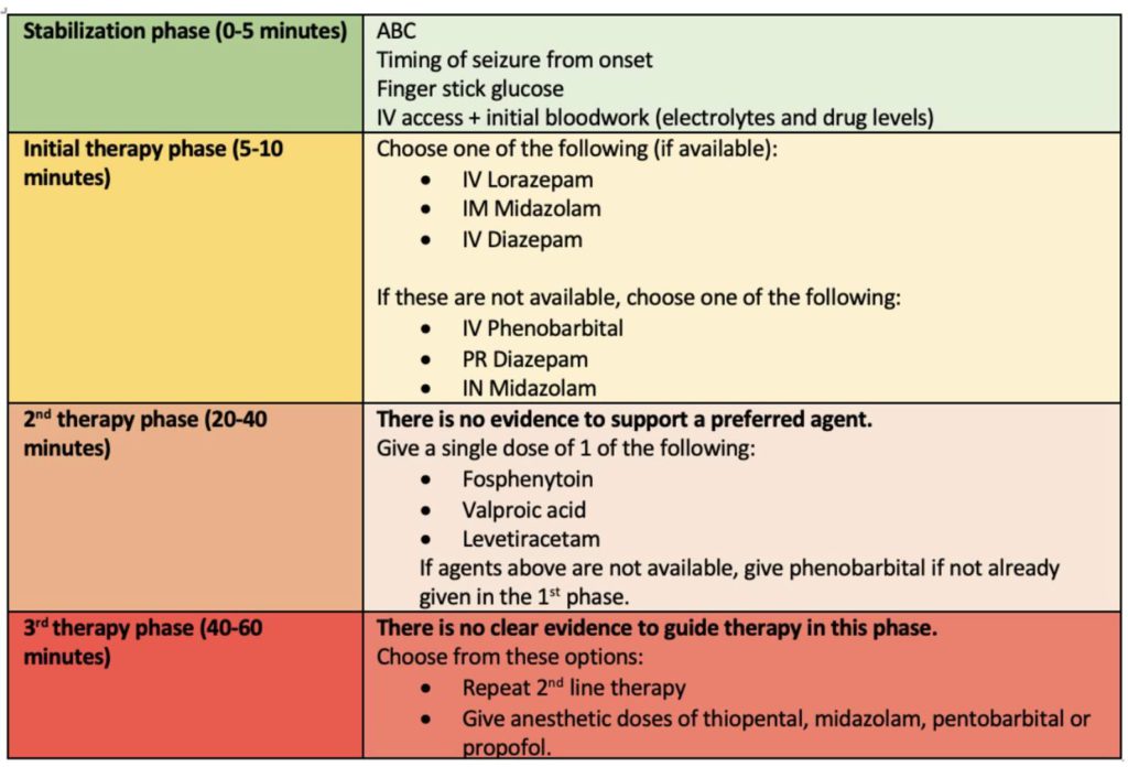 - If no response to benzodiazepines, give anti-epileptic medication (fosphenytoin, valproate, or levetiracetam) and prepare to intubate.