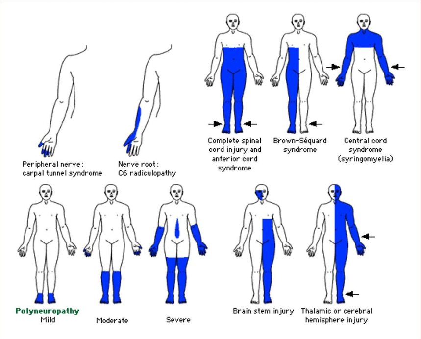In the above figures, the blue shading indicates hypalgesia (loss of pain and temperature sensation) and the arrows indicate limbs with significant accompanying weakness. In the Brown-Séquard syndrome (hemisection of the cord, top row, right), there is often diminished tactile sensation on the side of weakness and opposite the side with hypalgesia.