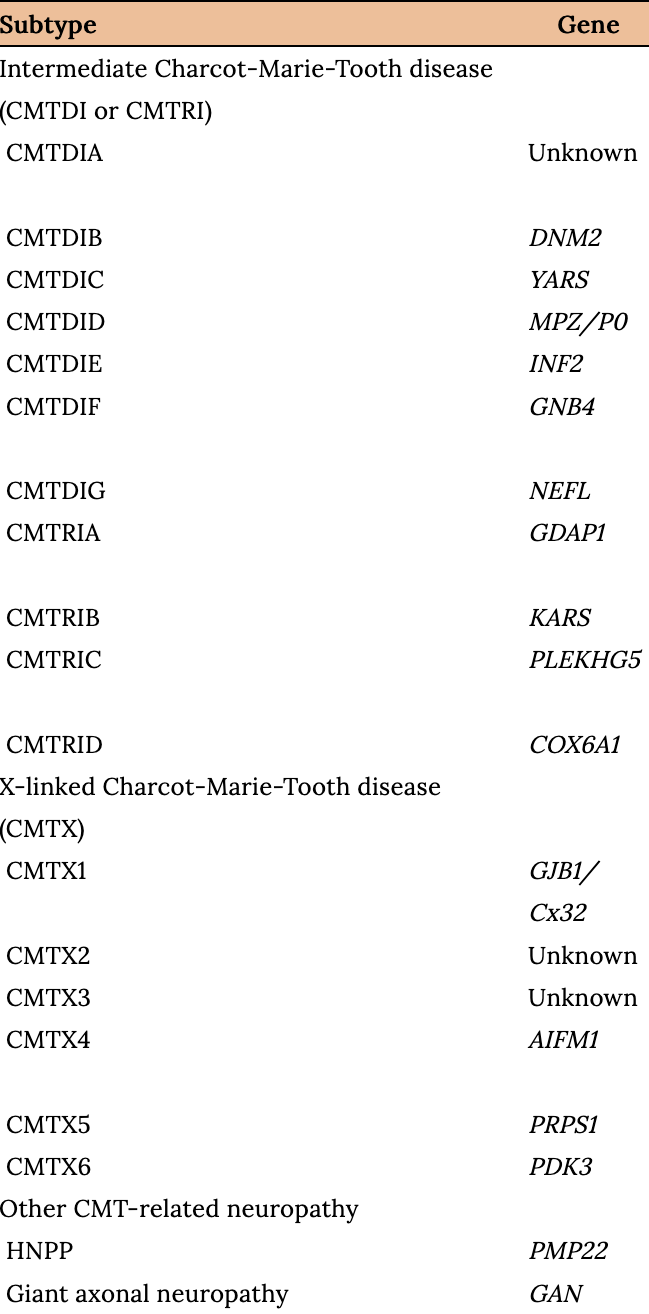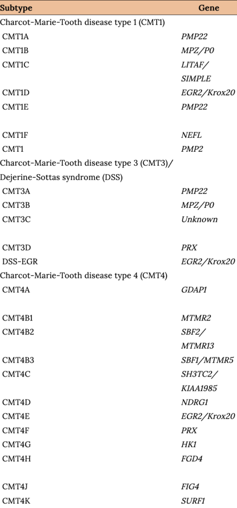 - Nam SH, Choi BO. Clinical and genetic aspects of Charcot-Marie-Tooth disease subtypes, Tables 1–3. Precis Future Med. 2019. Vol. 3(2):43-68. DOI: 10.23838/pfm.2018.00163