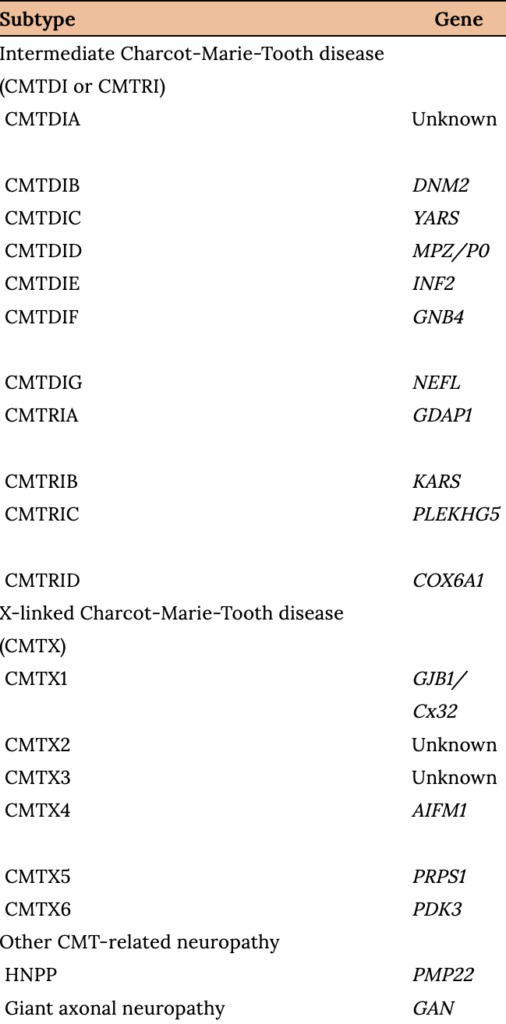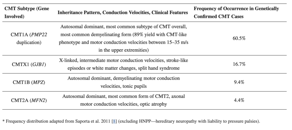 The most common Charcot-Marie-Tooth (CMT) genetic mutations and their clinical associations