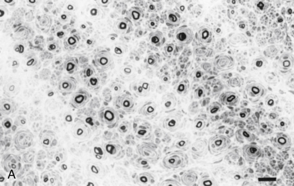 - Wallerian axonal degeneration with intact myelin sheath.