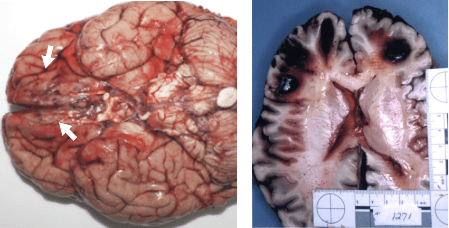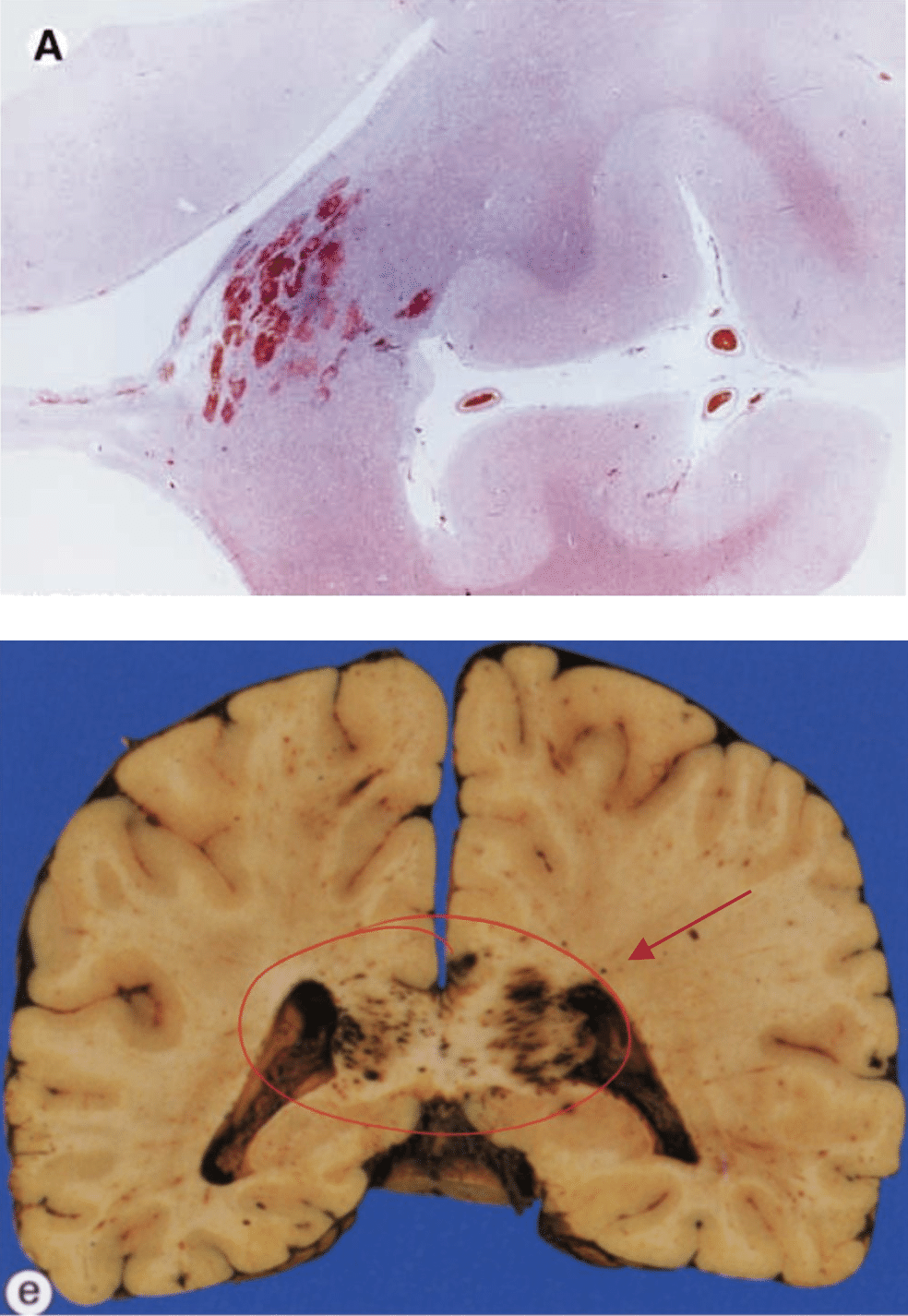 May result from a number of different insults, ranging from hemorrhagic stroke to infection, malignancy, vascular compromise (e.g. amyloid angiopathy), and trauma (incl. Coup/contrecoup injury). HTN usually involved.