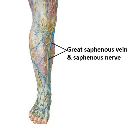 Probe through the superficial fascia on the medial side of the leg to find the saphenous nerve and the great saphenous vein. They travel together. Recall that the saphenous nerve is a sensory branch of the femoral nerve. The great saphenous vein is a tributary of the femoral vein.
