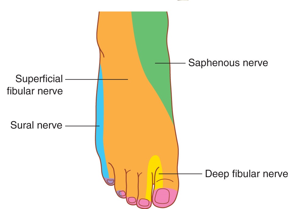 Most of the skin on the dorsal foot is innervated by the superficial fibular nerve. The webspace between the first and second toes receives sensory innervation from the deep fibular nerve. This patch of skin is also an autonomous zone for the L-5 dermatome. See Figure 11.