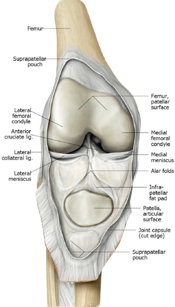 This pouch extends about one hands-breadth above the base of the patella. It normally contains a small amount of synovial fluid—enough to lubricate the space between the quadriceps tendon and the femur, so that no friction occurs here when the quads contract. In cases of knee trauma, this pouch can fill with bloody exudate, creating a dramatically large knee joint effusion.