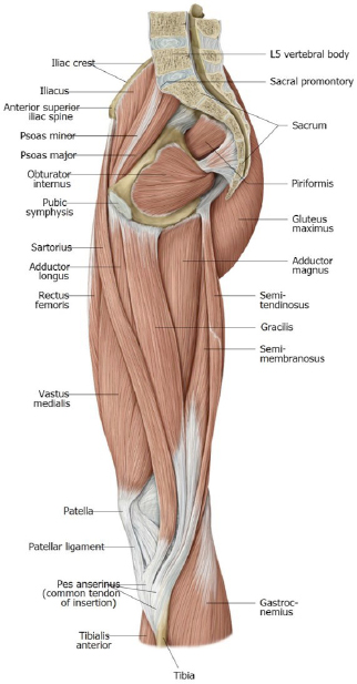The pes anserinus (“goose’s foot”) is a tendinous expansion on the proximal tibia, just below the medial condyle.