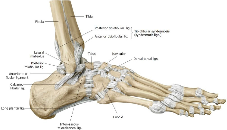 Lateral ligament of ankle—compound structure consisting of three ligaments: anterior talofibular, posterior talofibular, and calcaneofibular. The Anterior talofibular ligament is the most important clinically.