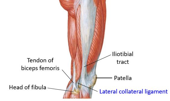 The lateral (fibular) collateral ligament (LCL) is an extracapsular ligament, meaning it stands alone outside the capsule of the knee joint. The lateral collateral is a narrow, but robust, band of tissue extending from the lateral epicondyle of the femur above to the head of the fibula below. See Figure 23. To find it, clean the area between the distal attachment of the iliotibial tract to Gerdy’s tubercle and the attachment of the tendon of biceps femoris to the head of the fibula. See Figure 24. You may need to trim away some of the IT tract to see the LCL. To verify it, try placing a varus force on the leg (move the distal part of the leg medially) while palpating the LCL—you will feel it become taut.