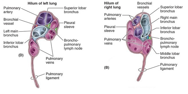 Compare and contrast right and left lungs—are the arrangements of structures in the lung roots different?
