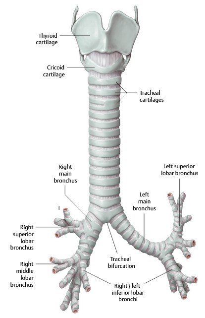 The trachea is the continuation of the airway distal to the larynx. It begins at C-6 and descends in the neck anterior to the esophagus. It is easily palpable just above the suprasternal notch, due to its “C”-shaped rings of cartilage that support the airway and prevent its collapse. The posterior surface that faces the esophagus has no cartilage—thus it is flat. The trachea passes through the superior thoracic aperture to enter the mediastinum.