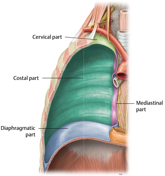 Parietal pleura lines the internal surface of the thoracic wall, the lateral side of the mediastinum, and the superior surface of the diaphragm. Thus, the parietal pleura faces the lungs and visceral pleura. The parietal pleura has four named parts: