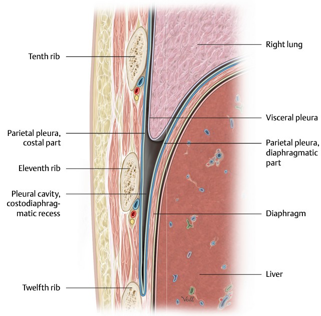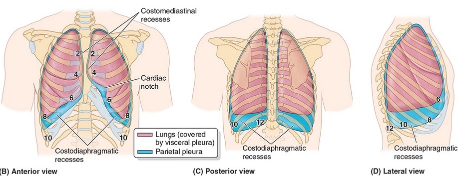 - During expiration, the lungs (covered in visceral pleura) do not fully fill the inferior-most part of the pleural cavities. These potential spaces below the lungs are called the costodiaphragmatic recesses. They form “gutters” around the edges of the domes of the diaphragm. When the lungs expand during inspiration, they slide down into the recesses (see Figure 35).