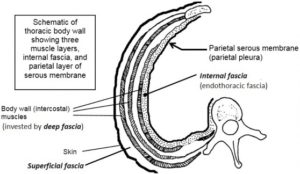 Internal fascia lines the inner aspect of the body wall (thus defining the body cavity), lying between the parietal layer of serous membranes and the deepest layer of skeletal muscles in the body wall. Its main function is support: to be the “wallpaper paste” affixing the parietal layer of the serous membrane to the body wall. In the thoracic wall this layer is called endothoracic fascia, lying between the parietal pleura and body wall muscles. Likewise, in the abdominal body wall it is referred to as endo-abdominal fascia, located between the parietal peritoneum and the body wall muscles.