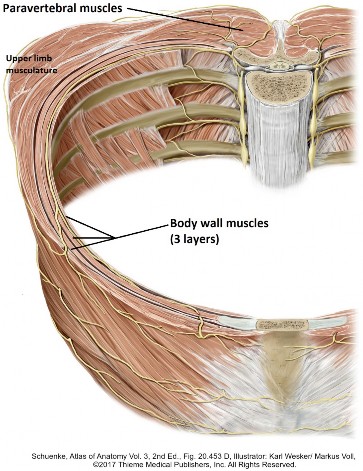 The body wall surrounds the body cavities of the trunk. The thoracic and abdominal body walls are architecturally very similar; one difference being the presence of bones (=ribs and sternum) in the thoracic wall. By learning the basic concept of the body wall it will be a snap for you to adapt it to your descriptions of the thoracic and abdominal body walls. We’ll skim through this subject, leaving the details for the Dissection Lab. In a nutshell, here are structures that make up the body wall in the thorax: