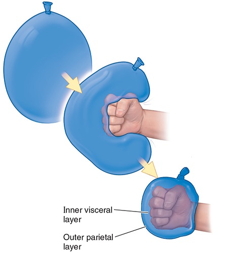 The arrangement of the serous sacs within the thoracic and abdominopelvic cavities can be modeled with an inflated balloon and your fist pushed into the balloon (Figure 1.4). The balloon is the serous membrane while the fist represents a visceral organ (lung or heart for example)—note that the part of the balloon’s surface that is away from the fist is curved and is the serous membrane that lines the inside of the body wall, while the part of the serous membrane in contact with the fist (i.e., the organ) conforms to the shape of the fist—the important point is that these two parts of the serous membrane are continuous and have a small space between them.