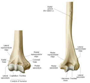 Distally, the shaft expands along its medial and lateral borders, forming the medial and lateral supracondylar ridges. These flare outward like groovy bell bottom pants and end as medial and lateral epicondyles, which are easily palpable through the skin and serve as important sites for muscle attachments. The wide distal part of the humerus between the epicondyles is called the condyle (Latin = knuckle). Subparts of the condyle figure prominently in elbow joint construction. Laterally, on the anterior side of the condyle is a round prominence resembling a marble = the capitulum (from Latin caput = head). Clinicians often call this structure the capitellum, which is an equivalent name. Medially is an oblong elevation resembling a spool of thread, visible on both sides of the condyle, called the trochlea (Latin = pulley, because the ulna spins around it). Above the trochlea on the anterior side is the coronoid fossa, where the coronoid process of the ulna slides when the elbow is flexed. Above the trochlea posteriorly is the olecranon fossa, where the olecranon of the ulna fits when the elbow is extended.