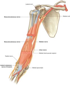 The musculocutanous nerve (from the lateral cord of the brachial plexus) penetrates and innervates the coracobrachialis (an important landmark in the dissection laboratory!). Afterwards, it enters the plane between the biceps brachii and brachialis muscles, innervating both. Distally it leaves this plane and enters the superficial fascia of the lateral forearm, becoming the lateral cutaneous nerve of the forearm.