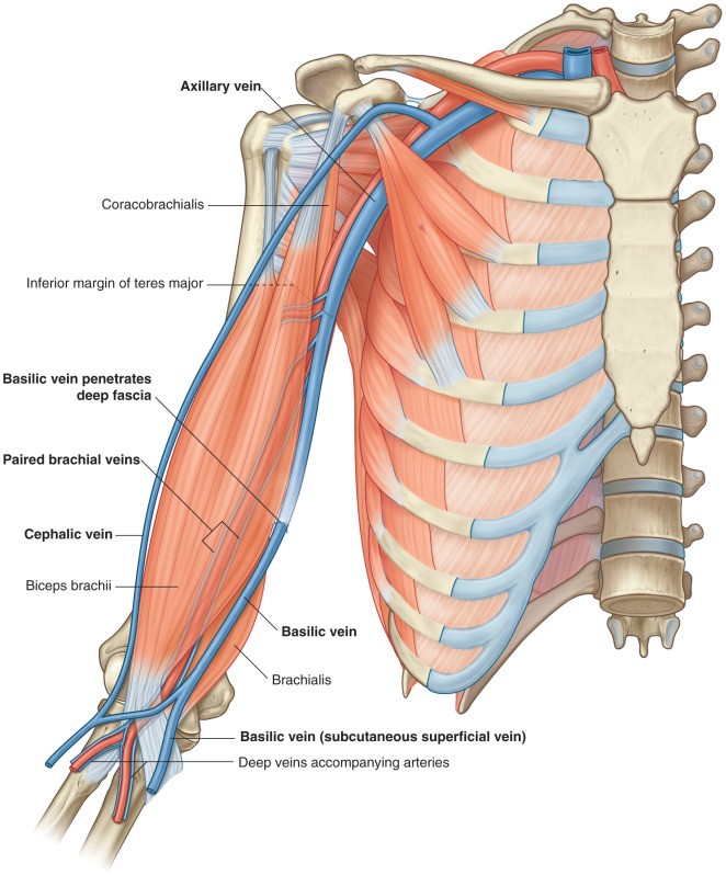 Superficial veins in the arm (also described in Introduction to the Limbs): These are in the superficial fascia. The basilic vein courses along the medial arm, sandwiched between the median and ulnar nerves. In the upper arm it penetrates the deep fascia and joins the brachial veins to form the axillary vein. The cephalic vein passes upward in the arm on the lateral side of the biceps, where it can be seen in lean individuals below the skin, popping out as the “body builder’s vein.” Above the arm the cephalic vein runs in a groove between the pectoralis major and deltoid muscles, then dives through the deep fascia to flow into the axillary vein.