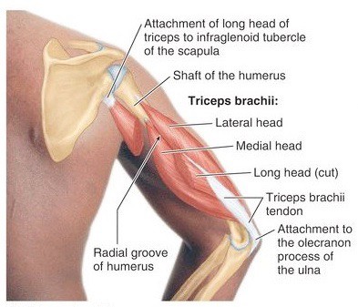 The main action of triceps is extension of the forearm at the elbow. The medial head is always active in this role; the long and lateral heads are recruited when extending the elbow against resistance.