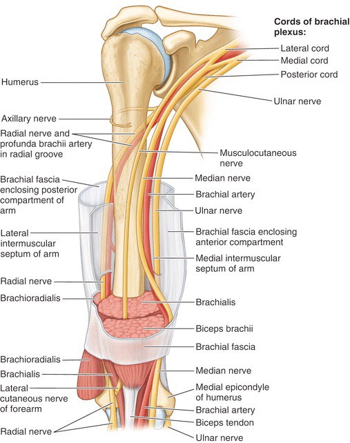 Figure 10.4 Nerves in the anterior compartment of the arm. DRAKE, GRAY’ S ANATOMY FOR STUDENTS, 4TH ED. FIG. 7.68.