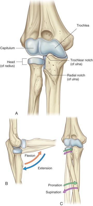 Figure 10.29 Bones and movements of the elbow complex. DRAKE, GRAY’S ANATOMY FOR STUDENTS, 4TH ED., FIG. 7.71.