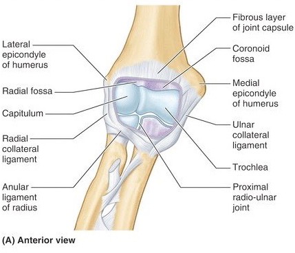 Figure 10.30 The elbow and proximal radio-ulnar joints are enclosed by a single joint capsule. MOORE ET AL., CLINICALLY ORIENTED ANATOMY, 8TH ED., FIG. 3.97.