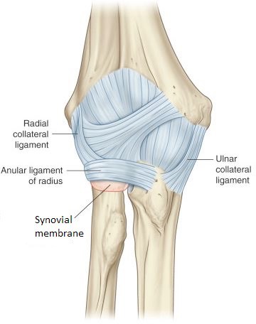 The elbow joint has typical features of a synovial joint. The articulating bony surfaces are covered with hyaline cartilage. The articular capsule of the elbow encloses all the articulating bony surfaces and their cartilages. The humero-radial, humero-ulnar, and proximal radio-ulnar articulations are all enclosed in a single joint capsule. A synovial membrane lines the inside of the joint capsule and the bony surfaces within the joint capsule that are not lined by cartilage.