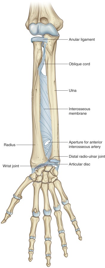Figure 10.33 Two radio-ulnar joints and an interosseous membrane bind the radius and ulna to one another. DRAKE, GRAY’S ANATOMY FOR STUDENTS, 4TH ED., FIG. 7.82.