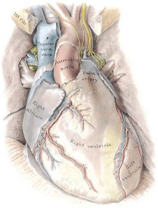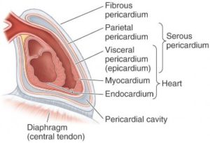Inside the fibrous pericardium and surrounding the heart is the serous pericardium, a typical serous sac having parietal and visceral layers. The parietal layer of the serous pericardium is fused to the inside of the fibrous pericardium and reflects on to the surface of the heart around the roots of the great vessels. Thus, the “sac” surrounding the heart that is visible in the cadaver when the chest wall is removed is composed of two fused layers. From embryology you learned that the fibrous pericardium was peeled away from the embryonic body wall and is formed from somatic mesoderm. Thus, if you consider the fibrous pericardium to be a body wall equivalent, the location of the parietal layer of the serous pericardium adjacent to it makes perfect sense. The outer layer of the heart itself is the visceral layer of the serous pericardium (aka epicardium). Between the visceral and parietal layers is the pericardial cavity, a potential space containing a small amount of serous fluid. The function of this fluid is to lubricate the surfaces of the serous pericardium to prevent friction and irritation to the tissues.