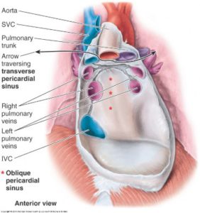 The left and right sides of the pericardial cavity are connected behind the ascending aorta and pulmonary trunk by a channel called the transverse pericardial sinus. This is useful to surgeons who can pass clamps or ligatures through the sinus in order to occlude the great arteries during cardiac surgery.