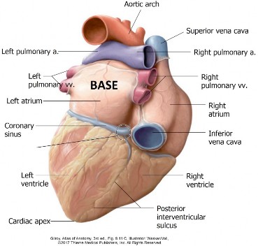 The heart resembles a short cone, having a base and apex. The base of the heart faces to the right and posteriorly. It consists primarily of the left atrium. The base is fixed to the pericardium since all the great veins enter the heart at its base. From the base, the heart projects down and to the left to terminate at the apex, which is located in the left 5th intercostal space, about 3 inches from the sternum, near the nipple.