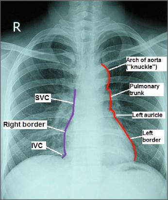 Note also that on a chest X-ray the shadows of great vessels are seen merging with the right and left borders of the heart. From superior to inferior: