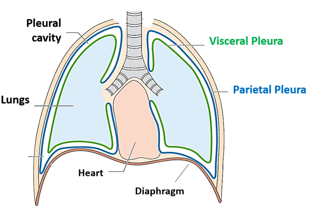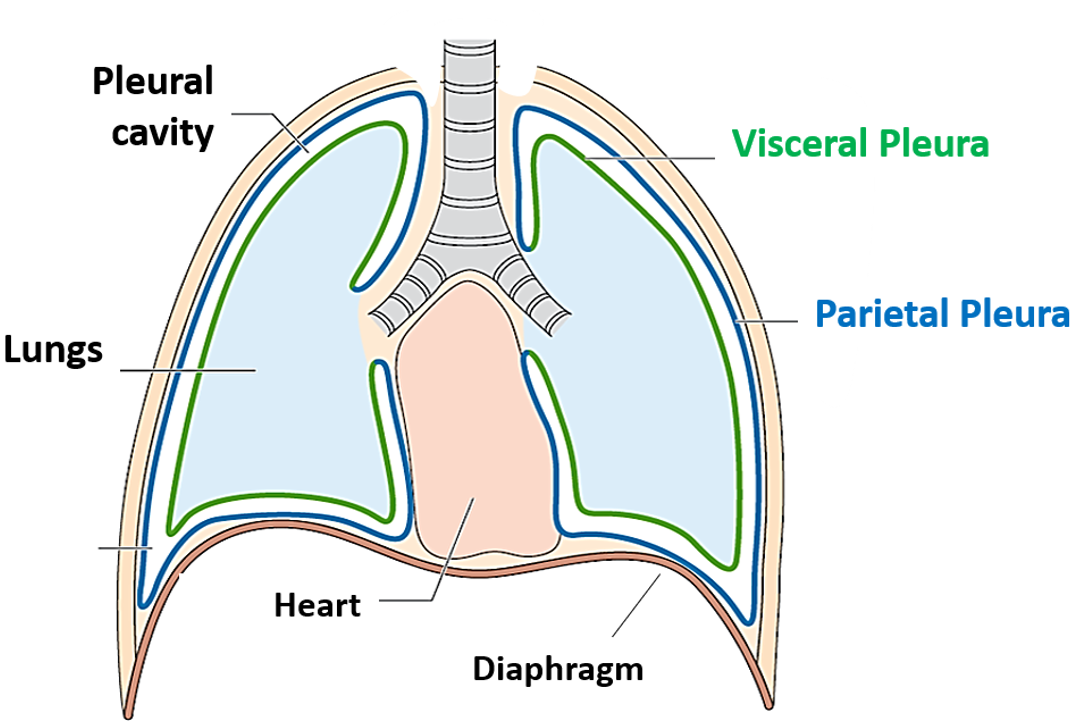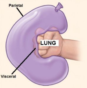 The visceral and parietal layers of pleura are continuous. This continuity occurs where the mediastinal pleura forms a cuff around the structures entering and leaving the lung (root of the lung), and from here, doubles back onto the surface of the lung to become visceral pleura. The parietal and visceral layers of pleura thus form a closed sac around the lungs = the pleural sac. Within the sac is the pleural cavity, which contains a small amount of lubricating serous fluid that allows the parietal and visceral pleurae to slide across each other without friction during respiration.