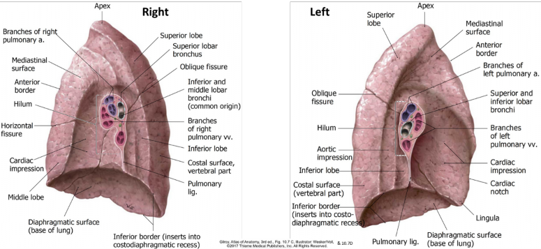 - Hilum: The depression on the medial surface of the lung where the root structures enter and leave the lung. It is the “portal” to the lung.