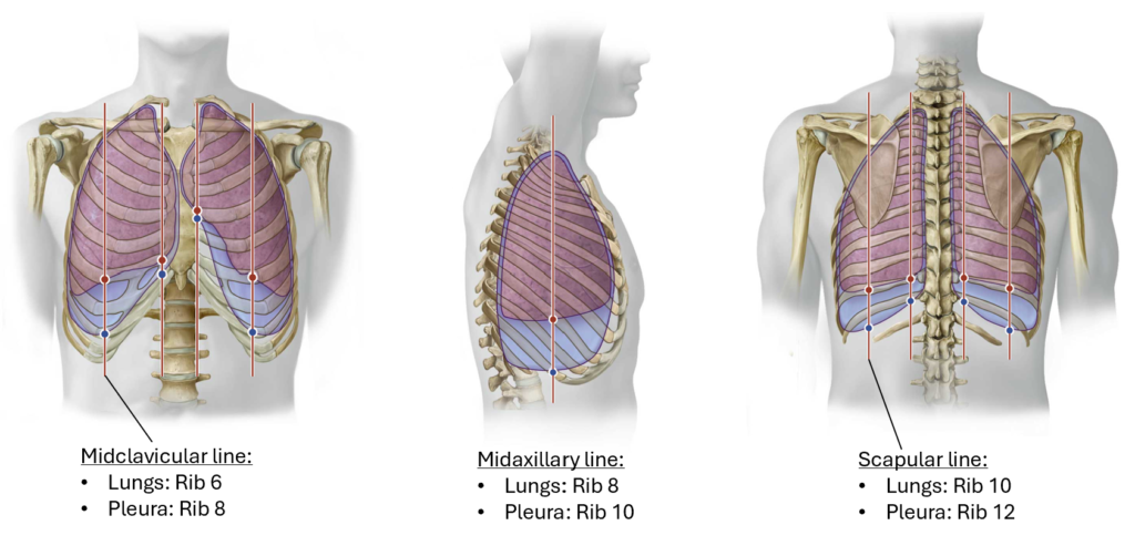 In quiet breathing, the inferior borders of the lungs remain about two ribs higher than that of the inferior extent of the parietal pleura in the costodiaphragmatic recesses. Use the “rule of twos” to locate the positions of lung and parietal pleura on the body wall, as illustrated in Figure 13.5.