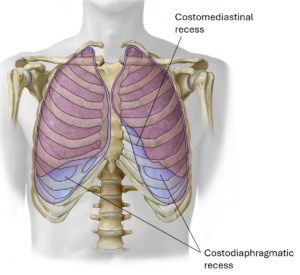 - Costomediastinal recess: Costal pleura leaves the anterior thoracic wall to become mediastinal pleura.