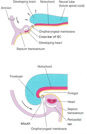 Within the “head” mesoderm are subsets of tissues that will form the heart (cardiogenic mesoderm) and the diaphragm (septum transversum). These primordial tissues along with the oropharyngeal membrane (future mouth) are located cranial to the developing neural tube before folding. After head folding,the definitive locations of the diaphragm and heart in the thorax, and the opening of the mouth on the face, are established, caudal to the brain. See the before and after in Figure 2.22.