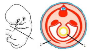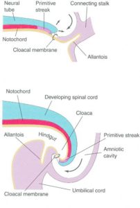 Similar to the head fold, the growing neural tube, amniotic sac, and somites overgrow the caudal rim of the embryonic disc. The caudal portion of the embryonic disc containing the cloacal membrane folds under the dorsal embryonic surface, becoming part of the embryo’s ventral surface. This explains the location of the anus anterior to the tip of the coccyx (and you thought the anus was on the “backside” of the body!). The tail fold also carries the connecting stalk (connecting the caudal end of the embryonic disc to the developing placenta) cranially until it abuts the yolk sac. See the before and after figures in Figure 2.23.