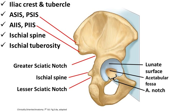 Please review the anatomy of the acetabulum, posterior hip bone, sciatic notches, and femur.