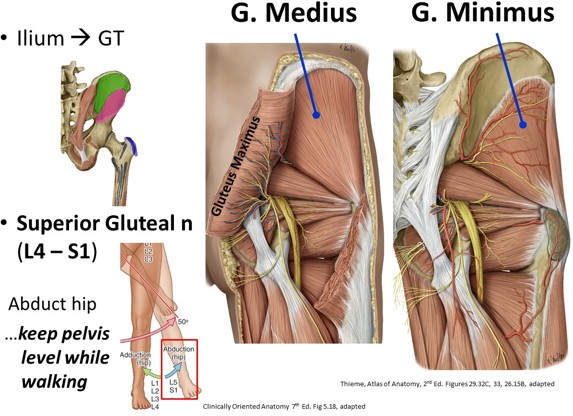 Everyday activity: The gluteus medius and minimis are abductors of the thigh, an important motion if you like to ski in the snow or the water. However, their main everyday importance is in walking. With one leg off the ground prior to taking a forward step, the Gmed and Gmin muscles of the planted limb (the limb whose foot is on the ground) contract to keep the unsupported limb (the limb on the opposite side, whose foot is off the ground) from falling down. Without theses muscles, the unsupported hip would drop suddenly each time you take a step forward.