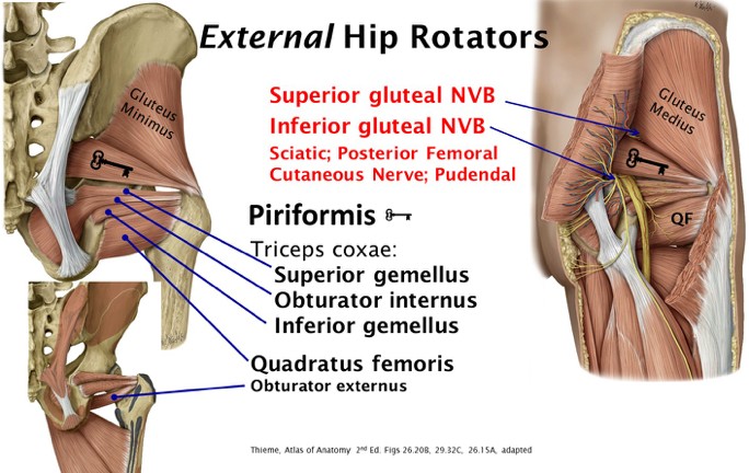 Hip external rotators: Piriformis, Gemellus Superior and Inferior, Obturator internus, and Quadratus femoris