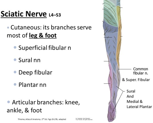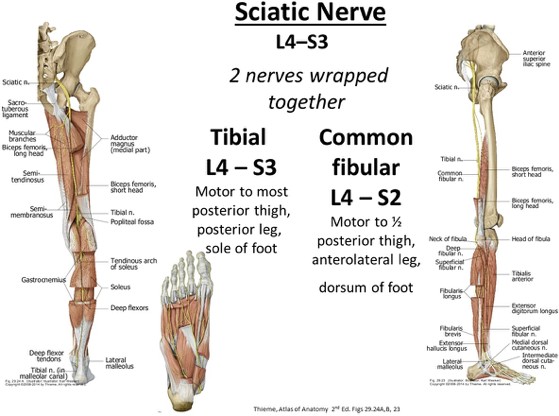In posterior thigh: 2 nerves separate and are then no longer called the sciatic nerve