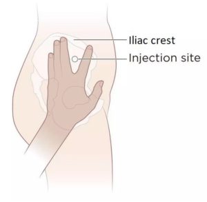 Retrace the course of the sciatic nerve; recall it is the most lateral “gluteal” nerve, and it doesn’t always exit inferior to the piriformis. Hitting the superior gluteal nerve will cause hip drop/ Trendelenburg sign! The safest site is in the superolateral quadrant of the buttock, from the posterior superior iliac spine to the superior border of the greater trochanter. Locate this site: put your index finger on the anterior superior iliac spine, and your middle finger on the iliac crest.Inject between the two fingers. See Figure 24.3.