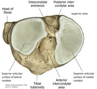 The flat proximal part of the tibia above the condyles, containing the intercondylar eminence and the articular surfaces, is referred to as the tibial plateau. It is an important weight-bearing part of the lower limb