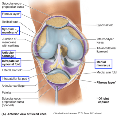Infrapatellar fat pad: Loose fatty tissue separating synovial membrane from deep surface of patellar ligament