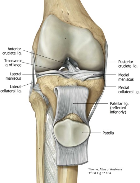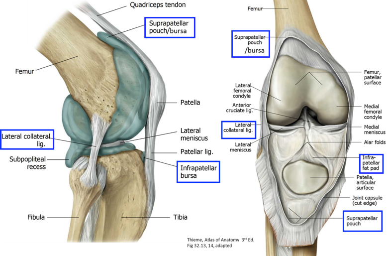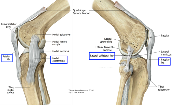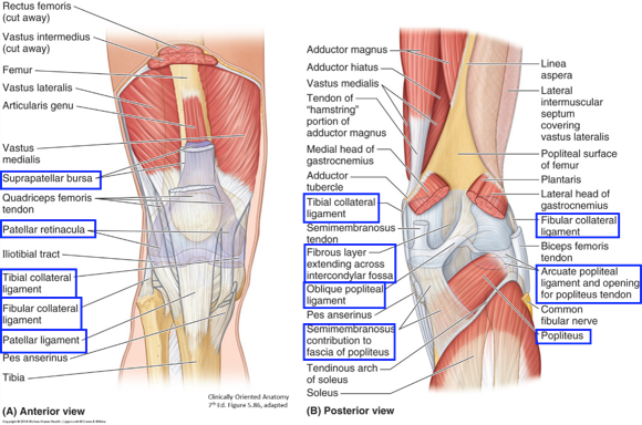 Patella: Continuous with fibrous capsule; most easily felt when leg is extended