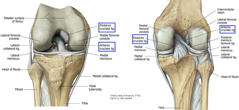 Anterior cruciate ligament (ACL): From the medial side of lateral femoral condyle to anterior tibial plateau