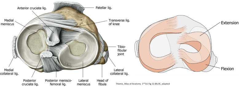 Medial meniscus: An open “C” with each end attached to the tibia by an anterior and posterior horn; attached at periphery to the capsule